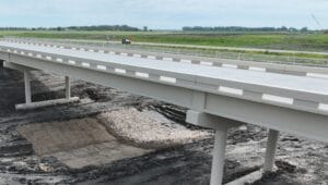 This bridge measures 410.5 feet in length, includes 18 girders each measuring 136 feet long, and features a pedestrian/bike lane on the south side. The crossing’s opening marks yet another milestone in the construction of the stormwater diversion channel and associated infrastructure portion of the FM Area Diversion project. Work on the crossing was completed by ASN Constructors and subcontractor Industrial Builders, Inc.